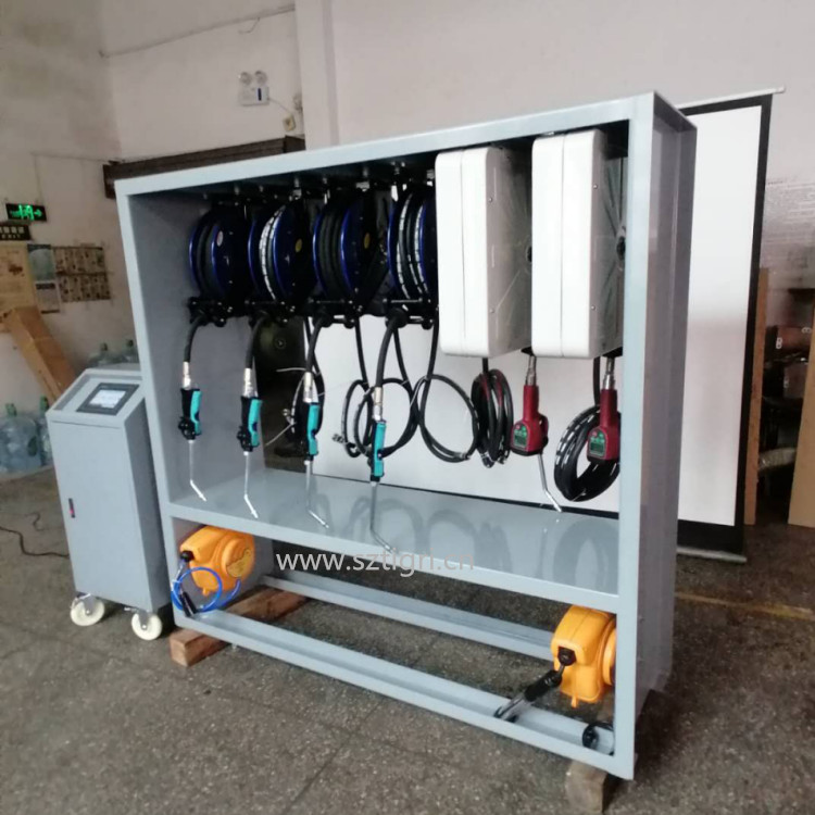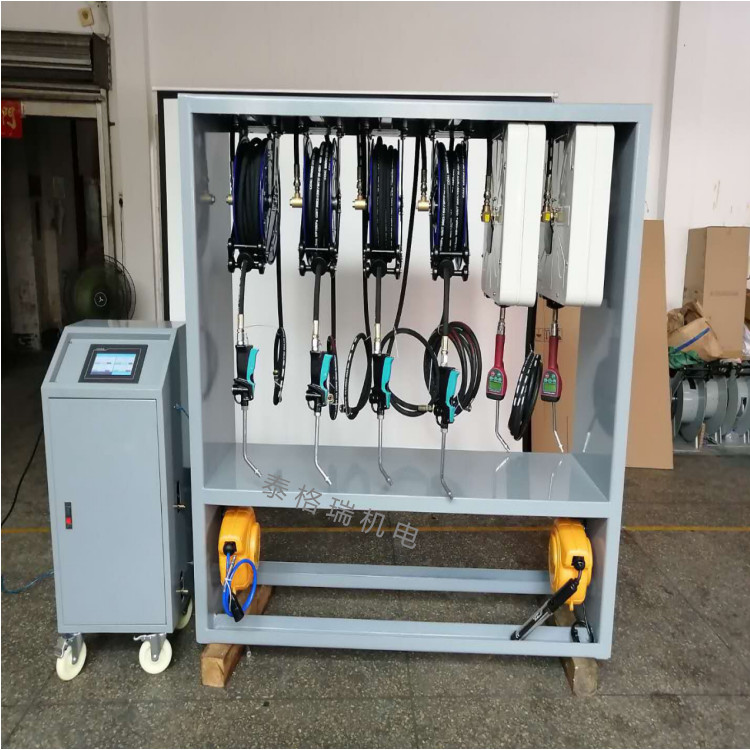 油料统一存放在油库里或用大油桶内, 采用气动柱塞泵为动力,经过高压软管将润滑油输送至工作车间,分出多个加注点,加注点工位处安装可伸缩自动卷管盘,加注枪。