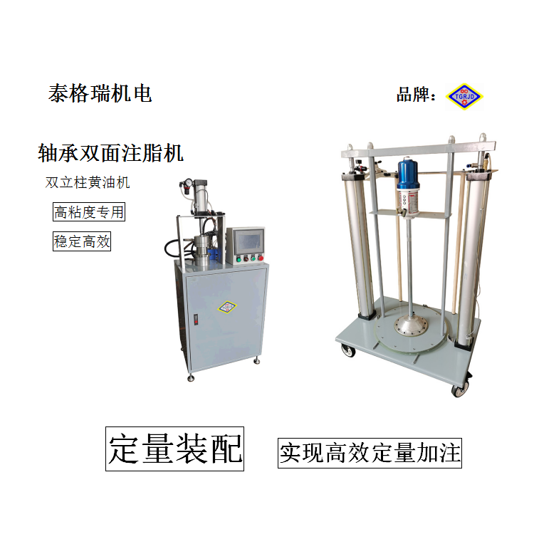 放入工件,启动脚踏工作按钮,工作指示等亮,升降气缸带动上加油头下压进入工件加油轨道,到达指定位置后,油脂定量阀在油脂泵高压作用下吐出定量的高压油脂,快速挤入工件内部,加注完毕后气缸上升复位,工作指示等灭,取出工件即可。